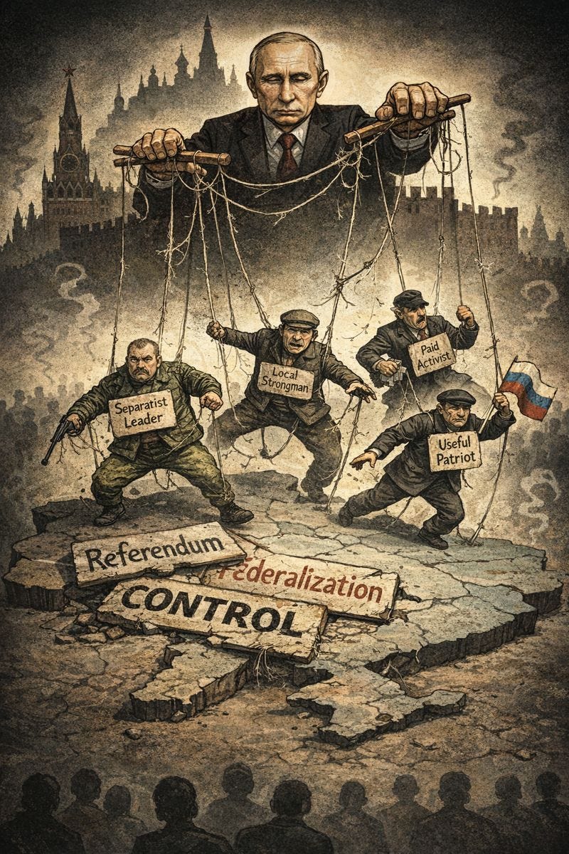 But Crimea, by February 27, was already functionally under Russian military control. The more urgent operational challenge lay elsewhere: in the Ukrainian mainland, where no Russian troops had yet appeared and where the infrastructure of destabilization remained incomplete.