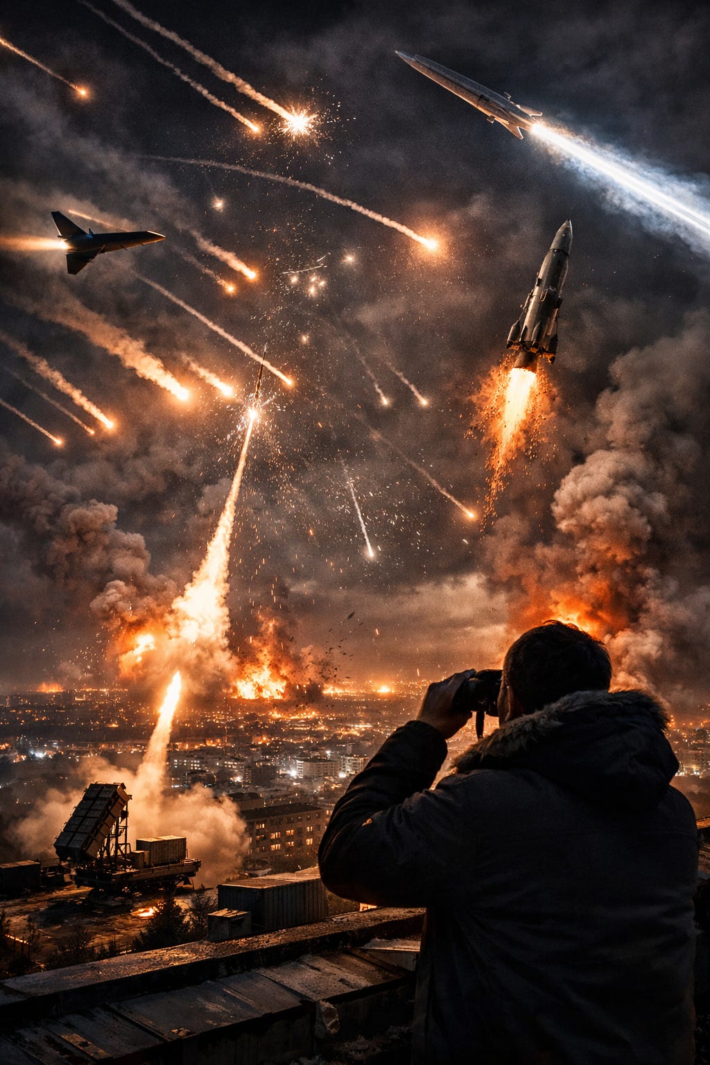 I watched from my window. Patriot launches from the southern arc. Orange flashes at altitude marking intercepts. The deep boom of explosions as debris hit the ground kilometers away.