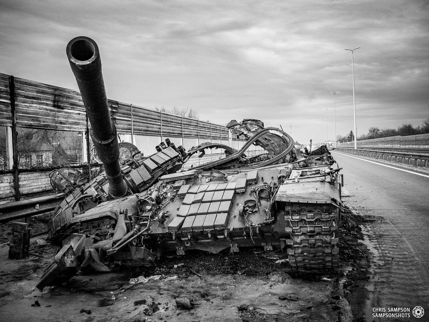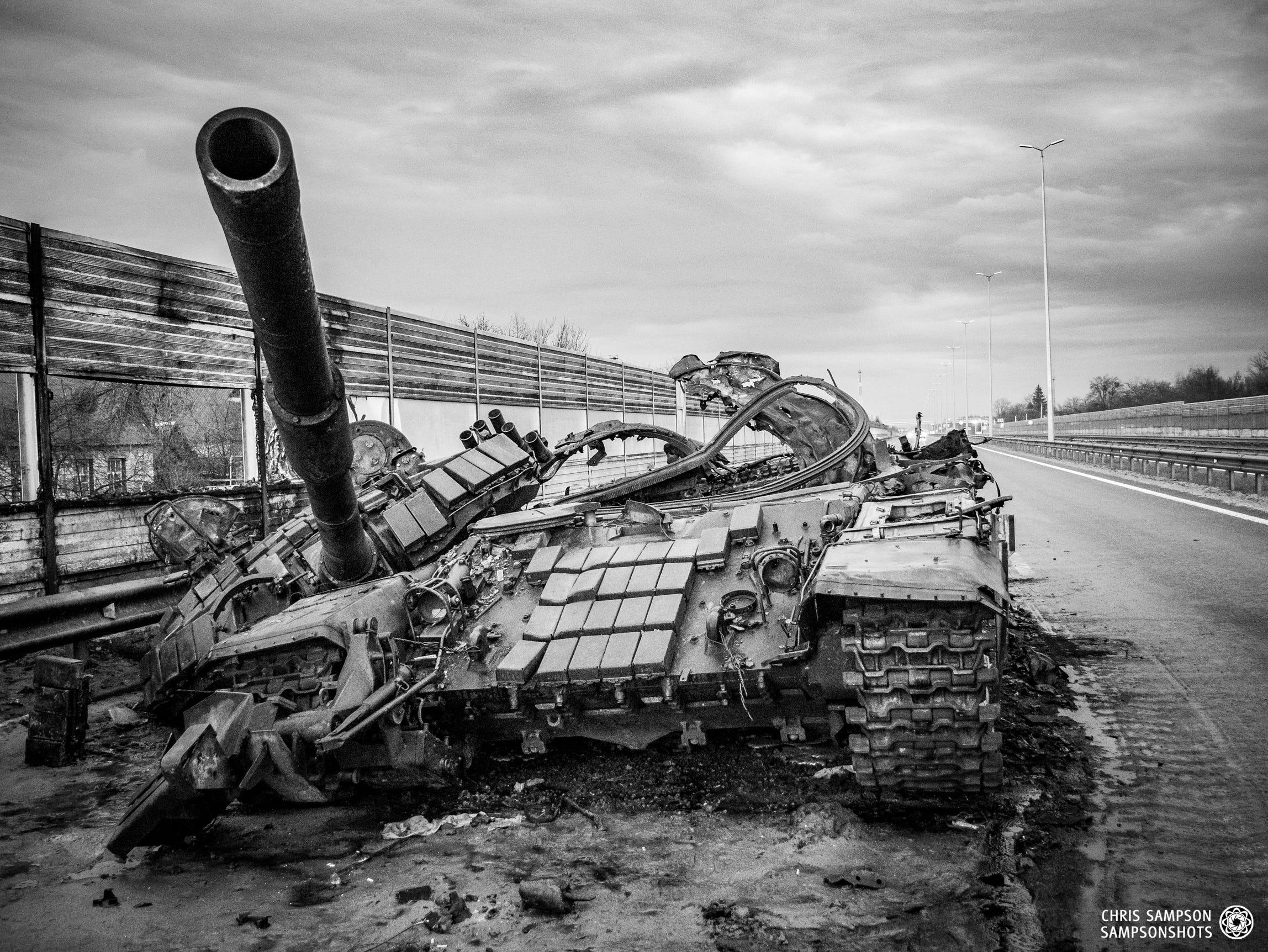(Russian tank decimated by Ukrainian forces on the western side of Kyiv, April 2022, Photo by Chris Sampson)